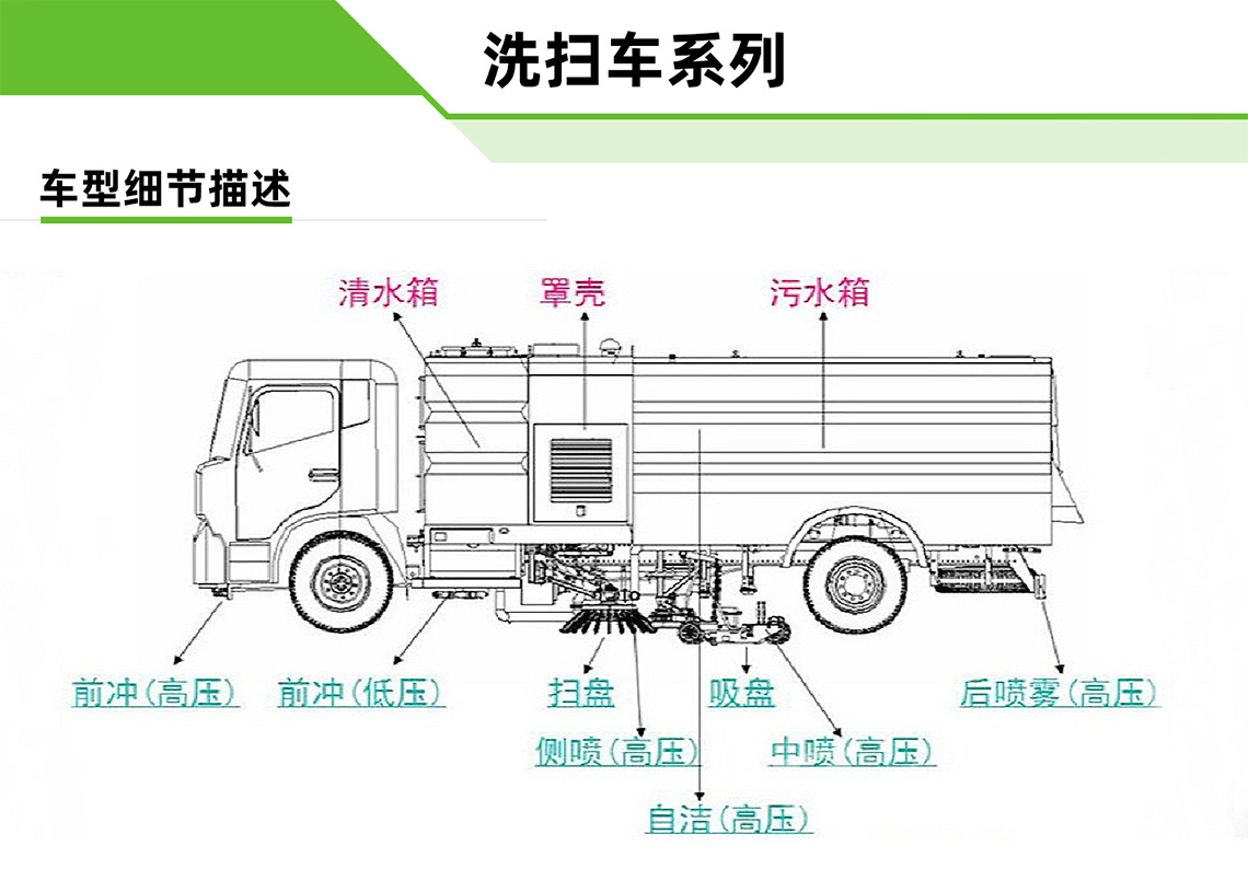 洗掃車集掃路車、灑水車和高壓清洗車功能于一體,具備路面清掃、路面洗刷、高壓清洗、低壓沖洗、路緣石洗刷、垃圾收集、污水回收、噴霧降塵和道路隔離墻清洗、小廣告清洗等多種作業功能。