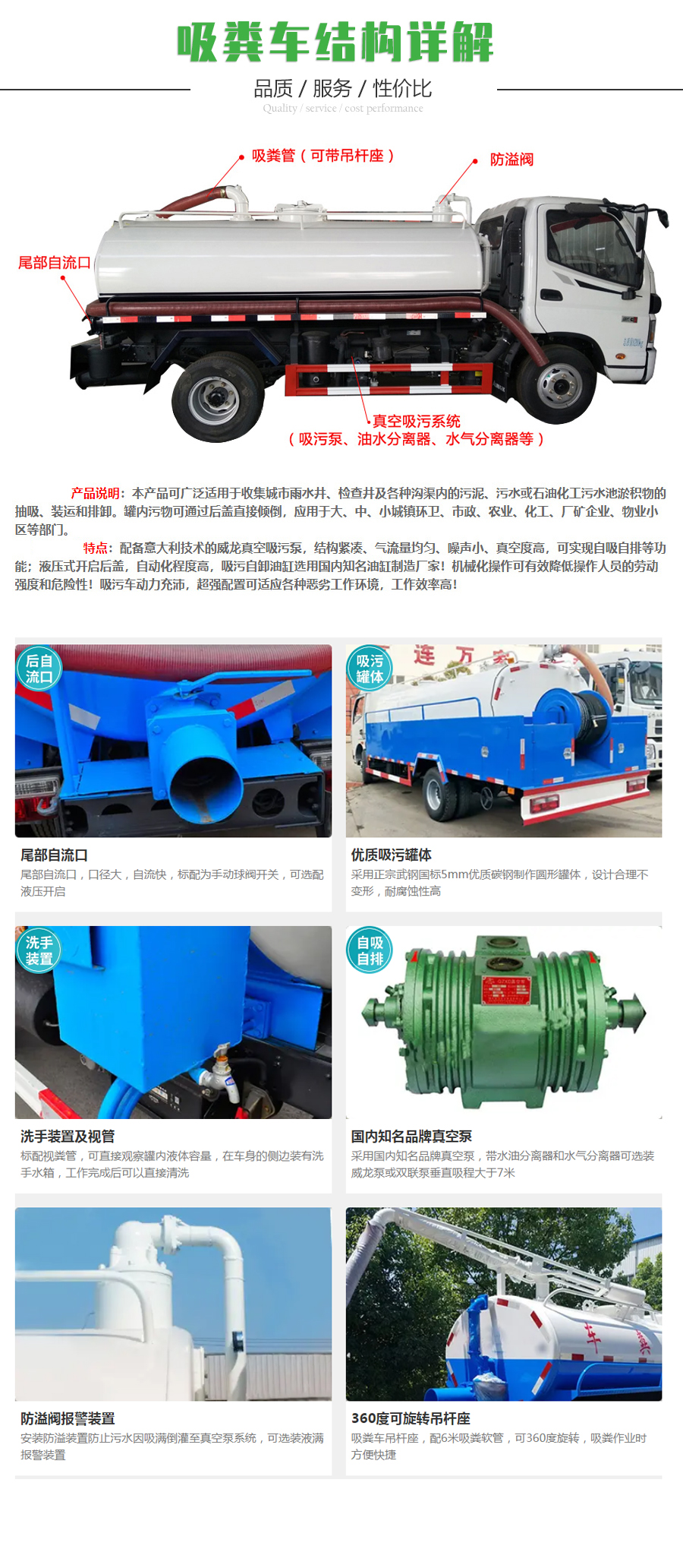 【性能簡介】真空吸糞車主要適用于小區物業、市政環衛、企事業單位、養殖場使用。下水道、雨水井、涵管、化糞池、沼氣池及各種溝渠內的廢水、污泥、泥漿、糞便抽吸、裝運和排卸。罐體設有液位計、高液位保護報警裝置、高液位保護防溢流裝置,防止吸滿倒灌真空泵系統。罐體前后封頭采用龜背式設計,永久不變形,吊桿式吸糞管可全方位360°旋轉、上下舉升,方便作業。真空泵可自吸自排,排糞采用自排和壓力排放。