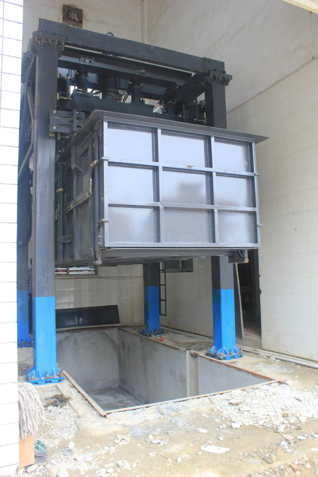 垃圾箱體是垂直式垃圾壓縮站的主體。它將各個系統(tǒng)和機構(gòu)有機的連接起來,完成垃圾的收集、壓縮。垃圾箱體的頂部設有投料口,主要用于垃圾的收集;垃圾箱體插銷孔座,通過壓頭的四個液壓插銷將壓頭與垃圾箱體連接在一起,并通過壓縮油缸實現(xiàn)上升和下降;垃圾箱兩側(cè)各設置有4組導向滑塊,確保垃圾箱上升和下降平穩(wěn);同時垃圾箱體中段與推鏟機構(gòu)、閘門機構(gòu)共同組成了一個密閉的空腔,以實現(xiàn)垃圾的垂直壓縮;壓縮完的垃圾塊儲存在垃圾箱體的出料口端,一次可儲存2塊垃圾塊。
