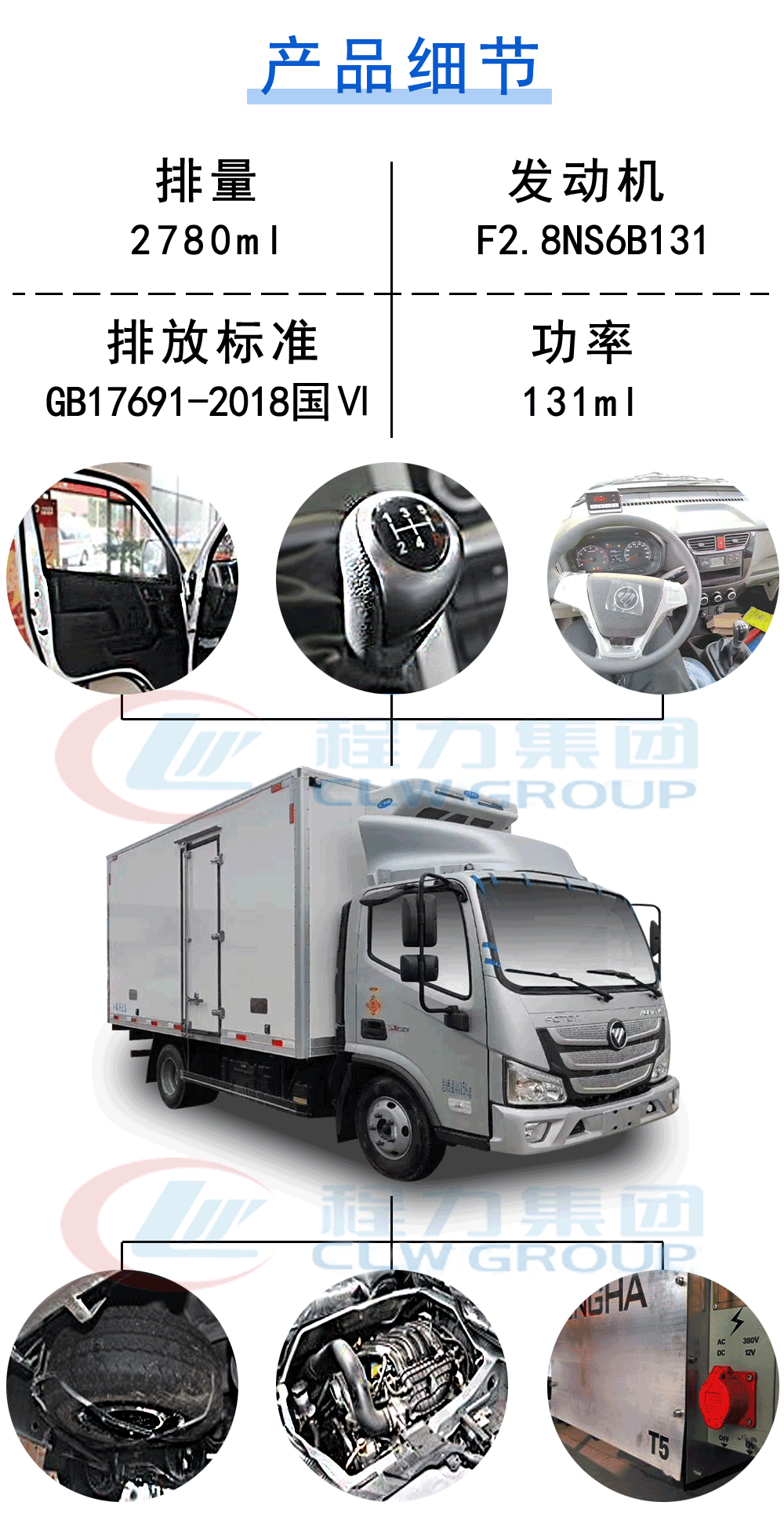 整車尺寸:5995*2340*3220 箱體尺寸:4080*2100*2100 功率/馬力:96KW/131馬力2780排量 福田康明斯發(fā)動機(F2.8NS6B131) 7.00R16LT輪胎