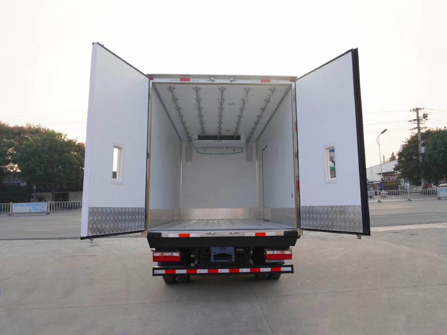 廂體工藝: 廂體材質(zhì)采用內(nèi)外玻璃鋼,中間8CM聚氨酯保溫板,后雙開門,廂體右側(cè)靠前選裝開側(cè)門,底部采用花紋防滑鋁板,前部排水孔,門邊條采用迷宮式橡膠密封條,鋁合金型材包邊,不銹鋼包角,不銹鋼門鎖,不銹鋼門框及合頁,廂體內(nèi)節(jié)能LED照明燈。